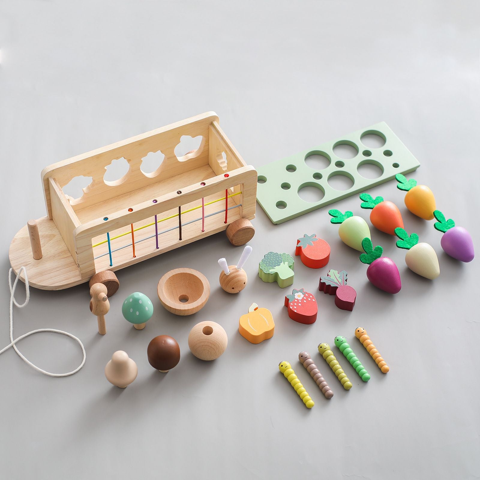 Mit seinem elastischen Band können Kinder die bunten Karotten herausziehen und wieder einsetzen – dabei trainieren sie spielerisch Feinmotorik, Farberkennung und Konzentration. Der kleine Holzwagen lässt sich mit dem Zugseil leicht ziehen und begleitet dein Kind auf all seinen Entdeckungstouren.
