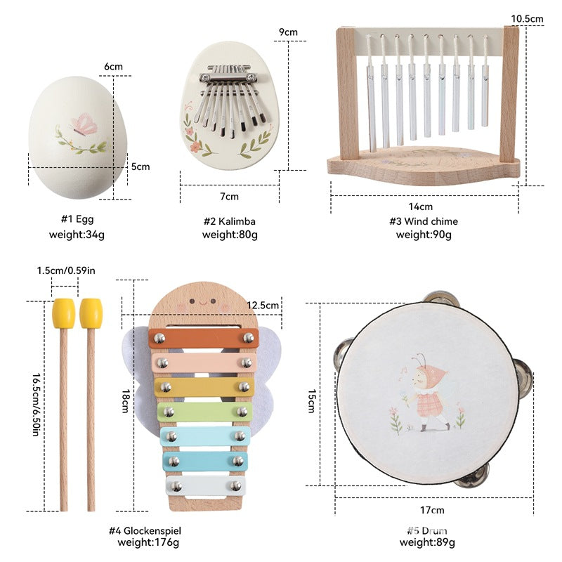 Das Set umfasst mehrere Instrumente – darunter ein Xylophon, eine Kalimba, Rasseln und Klangstäbe – und regt Kinder dazu an, Töne und Rhythmen selbst zu erzeugen. Durch das gemeinsame Musizieren entwickeln Kinder ein Gefühl für Klang und Takt, während sie gleichzeitig ihre Hand-Auge-Koordination und Konzentration verbessern.